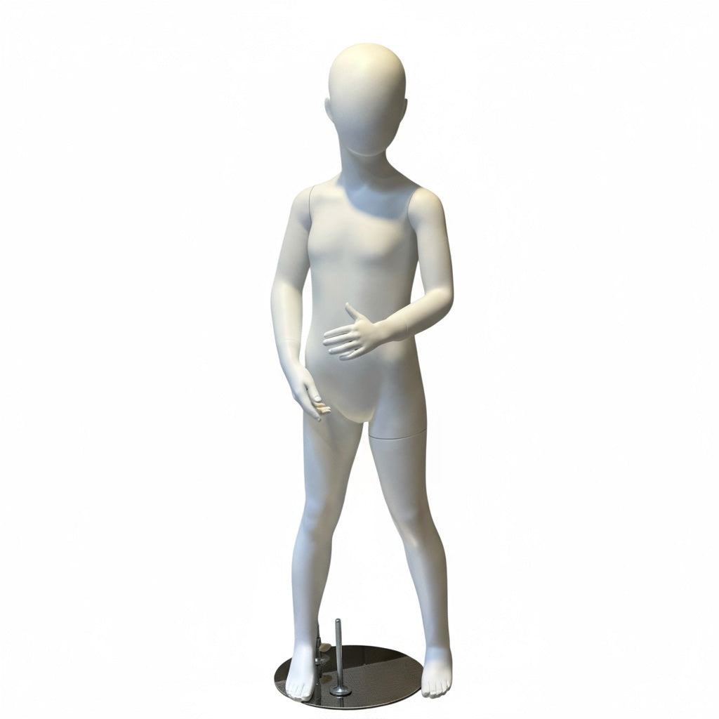 Børnemannequin, 6-8 år, H 122 cm, med hoved, med krom fodplade, Ø29 cm. Fod og lægspyd. Hvid. Glasfiber.
