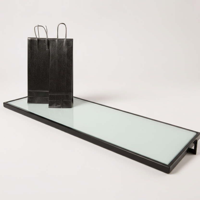 Komplet hylde sæt med en frostet glas hylde og hylderamme / stel i sort. Hyldestellet er nemt at montere direkte på væggen. Bemærk venligst, at skruer og rawlplugs ikke er inkluderet, da valget af disse afhænger af væggens materiale og struktur, hvor hylden skal monteres Mål: B 120 x D 37 x H 10 (på beslaget) cm. Det er muligt at købe et hylde sæt i samme serie, hvor der er monteret en kombineret bøjlestang med 2 fronthæng. HAPPY!-serien er designet til at passe ind i enkelte design stilarter og til at skabe et minimalistisk og smukt udtryk i enhver butik eller bolig. Brug HAPPY!-serien i hele butikken eller i et dedikeret salgs område.