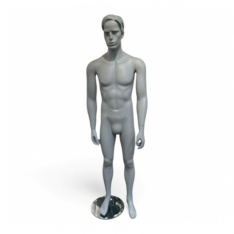 Herremannequin med ansigtstræk og skulptureret hår - få en mere livagtig præsentation. Herremannequinen leveres med en fodplade. Der har både læg- og fodspyd, hvilket gør. Det muligt at fremvise fodtøj. Mannequinen er fremstillet i glasfiber og kommer med rund fodplade i glas Mål: Højde 186 cm. Bryst 97,5 cm. Talje 77 cm. Hofte 94 cm. Fod 27 cm. Mat grå glasfiber. Rund fodplade i glas