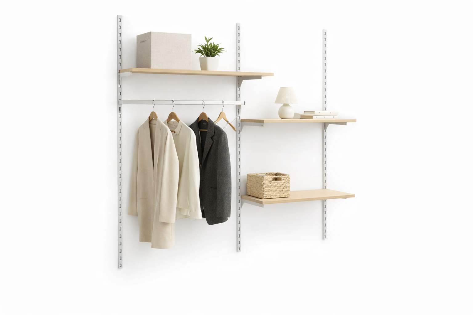 Lösningen består av vita väggskenor, hyllkonsoler, dekorstång och melaminhyllor i bok, som tillsammans ger en praktisk förvaringsplats för vardagens saker. | Normalpris