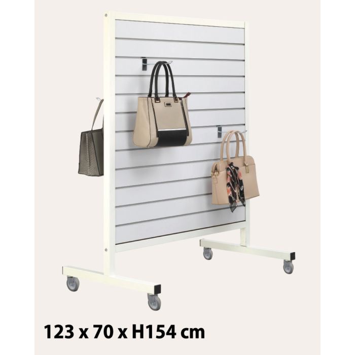 Salgsgondol med rillepanel – vit på vit En praktisk och stilren salgsgondol i vitt utförande – med rillepanel på båda sidor och stadigt stålstativ. Rillepanelerna gör det enkelt att presentera varor på krokar, hyllor eller hyllbärare, och lösningen passar perfekt för fristående uppställningar i butiken där varorna ska vara synliga från båda sidor. Idealisk för presentation av kläder, tillbehör, skor, presentartiklar, järnvaror eller kampanjvaror. Gondolen kan enkelt flyttas vid behov och passar i såväl detaljhandelsbutiker som showrooms och pop-up-miljöer. Mått: Rillepanelplattor på båda sidor (120 x 120 cm) Rilleavstånd: 10 cm / 11 spår. Vitt panel med aluminiumsprofiler Stativ i vitt metall Inkl. 75 mm hjulset för enkel förflyttning Höjd 145 cm
