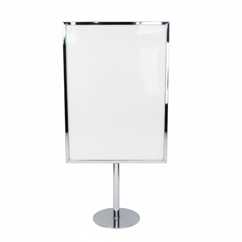 Vår klassiska menykorthållare i metall på ett stadigt runt metallfäste. Vår meny- eller skyltställning passar för alla typer av skyltning. Oavsett om det är laminerade skyltar, skyltar med plastfickor, papper eller kartong kan de sättas i vår menykorthållare. Foten har en fast höjd på 19 cm, men den kan förhöjas med upp till 15 cm med köp av en förlängare. Vi rekommenderar också att köpa plastfickor för att skydda pappersskylten mot slitage och smuts. Den galvaniserade modellen är särskilt lämplig för utomhusförsäljningsbord, där den tål olika väderförhållanden.