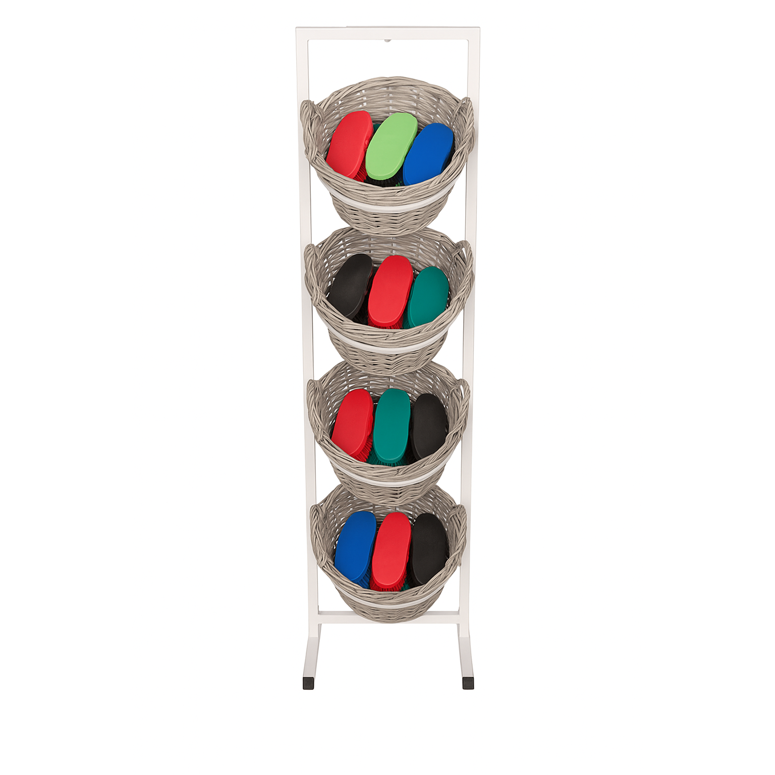 Korgställ med 4 korgar för dina varor. Möjlighet till A4 eller A3 metalskylt i toppen. Korgstället levereras med stödfötter. Ett hjulsats kan köpas till så att stället blir flyttbart och underlättar rengöring. Mått: B 45 x H 173 cm. Fot: B 45 x D 40,5 cm. Korgen har ett slitet utseende i stil med vår Heritage-inventarserie. Korgen levereras med ett plastinsats. Insatsen är fäst med en liten tråd som enkelt kan tas bort.